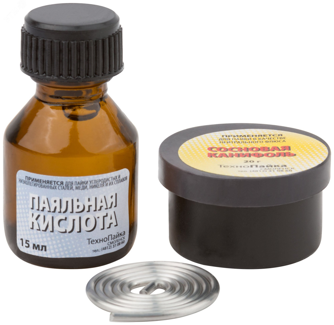 Набор для пайки КУРС РОС — универсальное решение для пайки. Набор включает в себя припой ПОС-61, сосновую канифоль и паяльную кислоту. Припой ПОС-61, благодаря своим характеристикам (низкая температура плавления, прочность, пластичность, универсальность), широко используется в радиоэлектронике и при пайке проводов. Канифоль сосновая повышает прочность соединения. Паяльная кислота (высокоактивный флюс на основе хлористых солей цинка) предназначена для пайки и лужения стали, чугуна, латуни, железа, бронзы, меди, никеля, серебра и др.