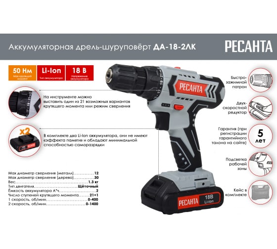 Дрель-шуруповерт бытового назначения Ресанта ДА-18-2ЛК применяется для создания отверстий и закручивания крепежей при работе с деревянными, металлическими и пластиковыми конструкциями. Щеточный тип двигателя обеспечивает максимальный вращающий момент 50/25 Нм. Наличие двух аккумуляторных батарей Li-ion емкостью 2 А*ч с быстрой зарядкой в течение часа позволяет непрерывно работать длительное время. Напряжение 18 В обеспечивает высокую производительность. Два режима работы со скоростью вращения 0-400 и 0-1400 об/мин позволяют настраивать интенсивность воздействия в зависимости от плотности материала. Максимальный диаметр отверстий для древесины составляет 30 мм, для металлических изделий до 12 мм.