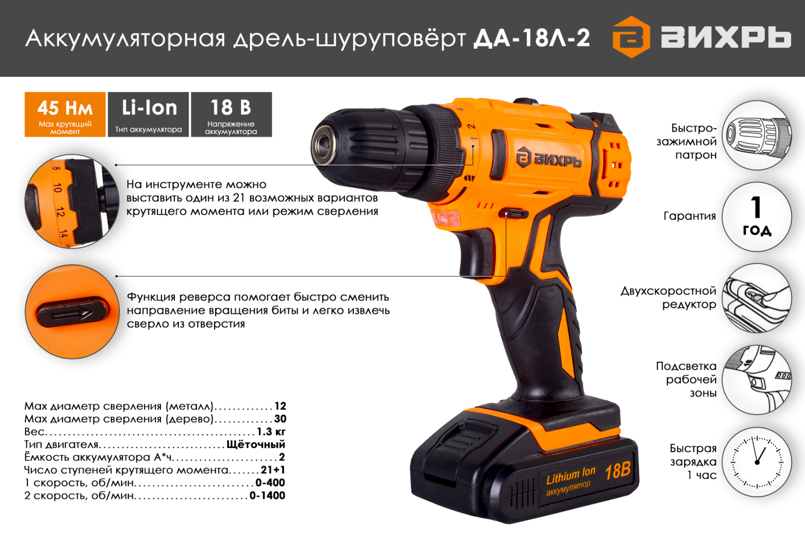 Аккумуляторная дрель-шуруповёрт Вихрь ДА-18Л-2 72/14/16 - позволяет быстро и аккуратно вворачивать и выворачивать шурупы, а также сверлить отверстия в дереве, металле, пластмассе и т.д. На инструменте можно выставить один из 16 возможных вариантов крутящего момента или режим сверления, в зависимости от выполняемой задачи. Функция реверса помогает быстро сменить направление вращения биты и легко извлечь сверло из отверстия.