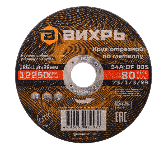 Круг отрезной Вихрь 125х1,6х22мм применяется совместно с угловыми шлифовальными машинами (болгарками) для работ по металлическим заготовкам. Диск можно раскручивать до 12250 оборотов в минуту. Круг имеет высокий запас прочности и технологичную конструкцию.