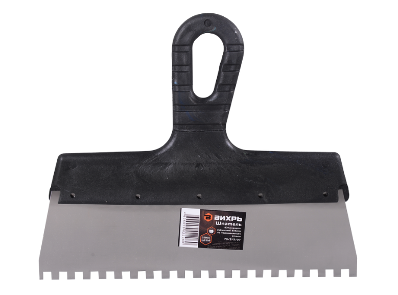 Шпатель зубчатый ВИХРЬ используется для отделочных работ: нанесения цементного раствора или плиточного клея на небольшую по площади поверхность. Шпатель из нержавеющей cтали, шириной 250 мм. Рукоятка из прочного пластика, с изогнутой ручкой. Шаг зуба 6х6.