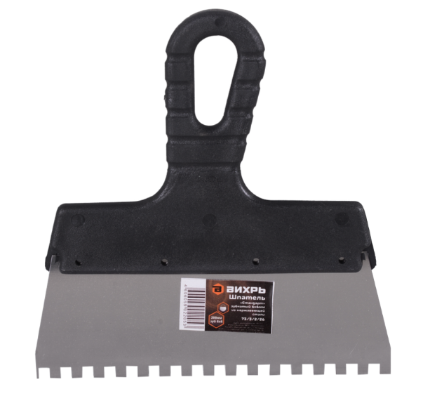Шпатель зубчатый ВИХРЬ используется для отделочных работ: нанесения цементного раствора или плиточного клея на небольшую по площади поверхность. Шпатель из нержавеющей cтали, шириной 200 мм. Рукоятка из прочного пластика, с изогнутой ручкой. Шаг зуба 6х6.